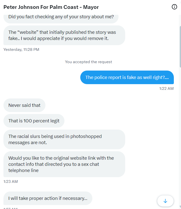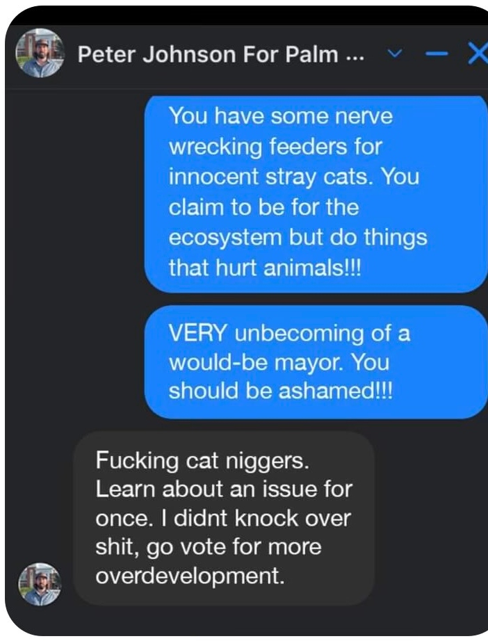 The screenshot sent to the DC Patriot allegedly shows Peter Johnson responding to a message sent to his campaign Facebook page. Visible is Johnson’s campaign page titled “Peter Johnson For Palm Coast,” The message included a derogatory and racist term directed at a member of a community program to rescue stray cats within Palm Coast. The derogatory language and hostile tone of the message have left many residents shocked and questioning the integrity of Johnson’s campaign. This does not appear to be Johnson’s first confrontation with a member of the volunteer-based Community Cats of Palm Coast.