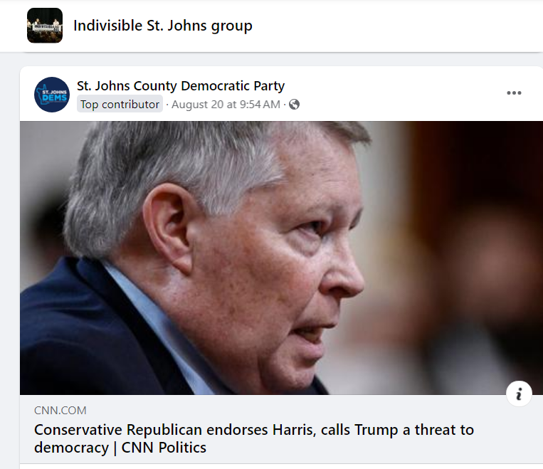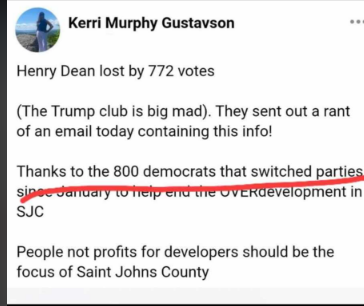I believe that Saint Johns County was always the intended local target. The results of the 2022 Saint Johns County primary show that the Indivisible infiltrators are on the verge of being successful. Social media posts made by the group shows that their strategy was to have Democrats register as Republicans in order to impact the primary election at the county commission level.