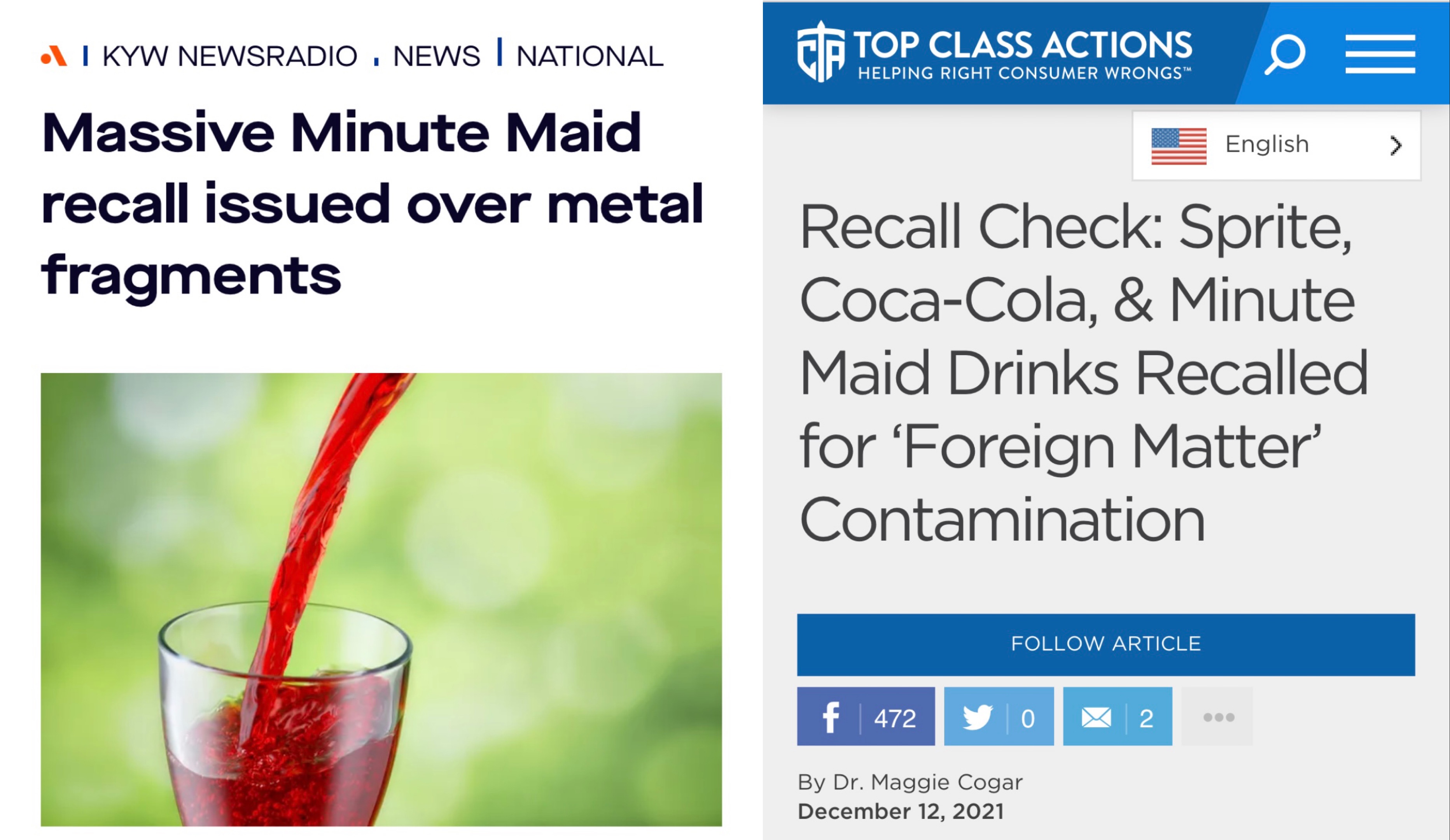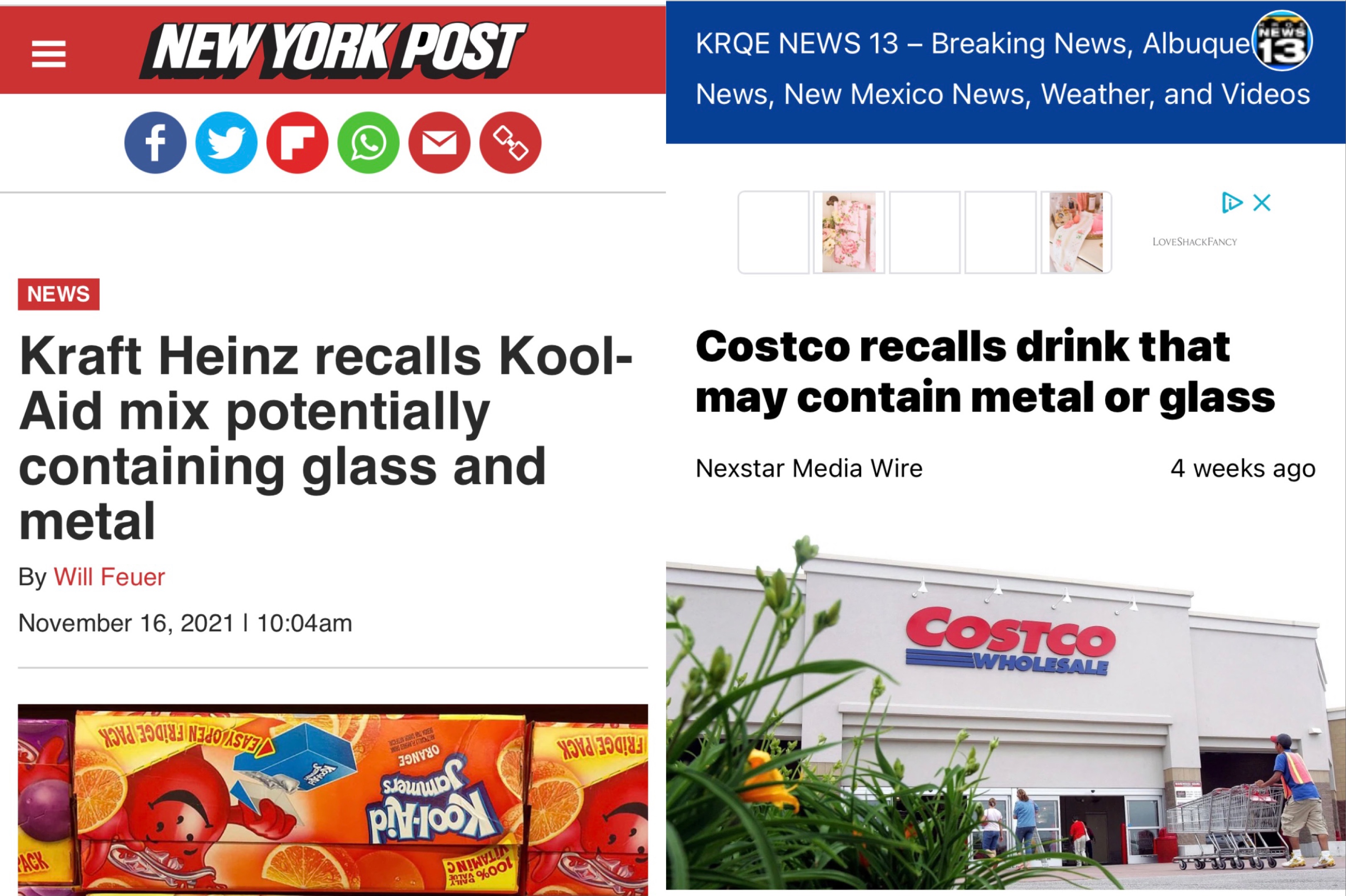 The “conspiracy theory” that came after that, was the fear they’d start putting metal in our food supply…and I hate to tell you, but that’s exactly what’s happening now. Normally food recalls are rare, occasional, and blasted all over the news so people can check their pantries and fridges to make sure they’re not going to due from eating someone…but not this time. Flying under the radar these last few weeks have been some major recalls involving heavily popular and consumed products…and all of them for containing metal and other toxic substances. Included in the recall are several majorly popular brands like Kraft-Heinz, Coke, Sprite, Kroger, Bird’s Eye, Minute Maid, Country Time lemonade, Arizona Ice Tea, (and ironically) Kool Aid products.