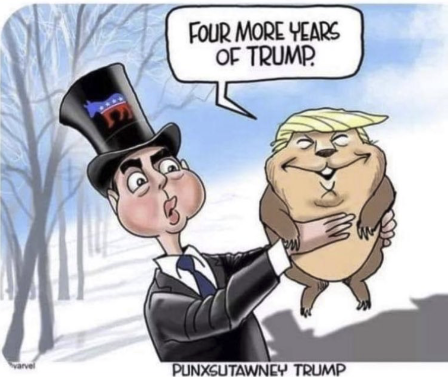 He pulls out a groundhog that looks a little like President Trump, to which the cartoon says “Four More Years of Trump.”