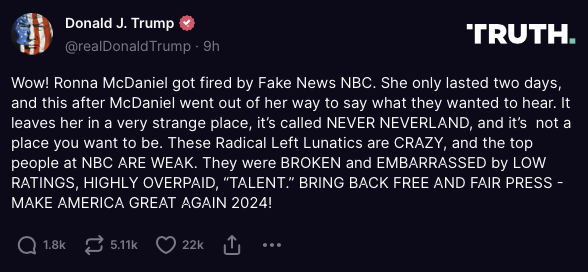 “Wow! Ronna McDaniel got fired by Fake News NBC. She only lasted two days, and this after McDaniel went out of her way to say what they wanted to hear. It leaves her in a very strange place, it’s called NEVER NEVERLAND, and it’s not a place you want to be. These Radical Left Lunatics are CRAZY, and the top people at NBC ARE WEAK. They were BROKEN and EMBARRASSED by LOW RATINGS, HIGHLY OVERPAID, “TALENT.” BRING BACK FREE AND FAIR PRESS ”“ MAKE AMERICA GREAT AGAIN 2024!”