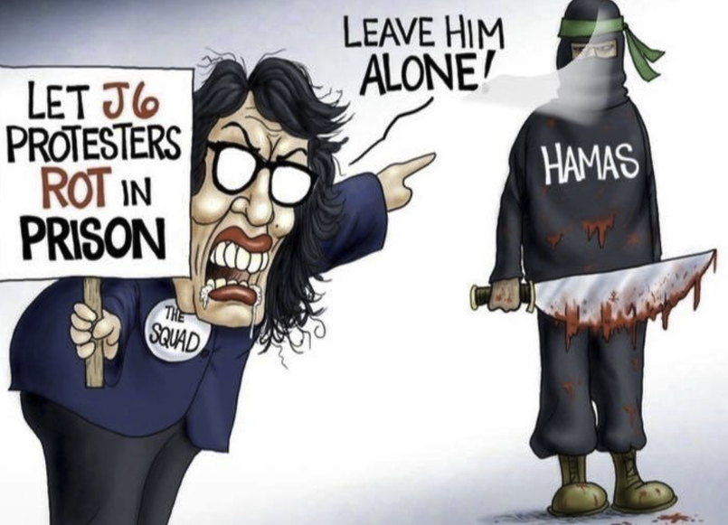 The other part of the cartoon shows a Hamas terrorist holding a massive bloody knife, with the member of The Squad screaming “Leave Him Alone!”