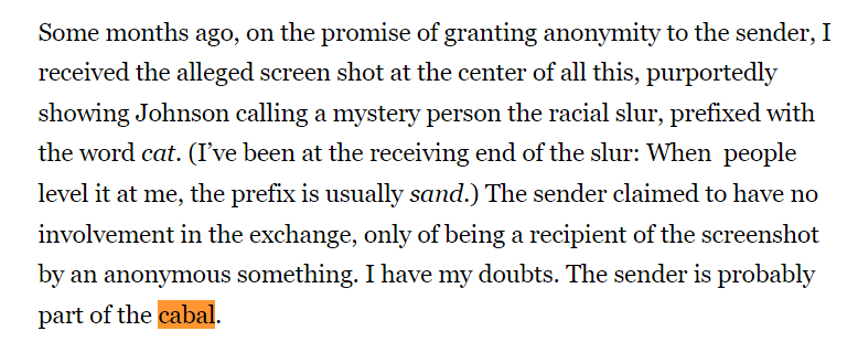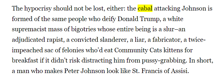 The reality is that in his own article defending Johnson, Tristam mentions some sort of “cabal” that he has concocted in his own mind. It is actually quite shocking to watch a known liberal blogger develop such unfounded conspiracies.