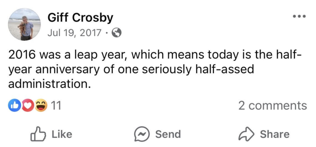 I have heard from many people in Saint Johns County who Nicole Crosby was. I decided to take a look for myself. Nicole’s social media profile is extremely vanilla with consistent posts about development and environmentalism. Her husband’s social media profile tells a completely different story. In her comment to the DC Patriot, Crosby claims to have been engaged in actively supporting Donald Trump in his previous campaigns. Her husband very publicly shares a different opinion as seen in this 2017 post.