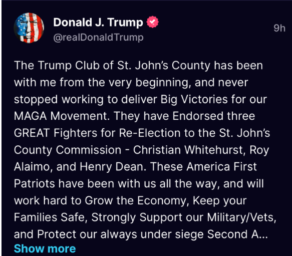 Mr. Taylor began the conversation by stating that they were handing out the official Saint Johns County Voter guide that contained the MAGA candidates. I then asked Mr. Taylor a follow up question. My question was, “Wouldn’t the Trump endorsed candidates be the MAGA candidates”? He then launced into a tirade about the Saint Johns County Trump Club (mentioned in Trump’s Truth Social post) and all of the endorsed candidates.