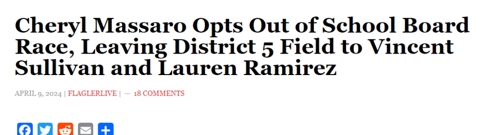 Current incumbent Cheryl Massaro had initially filed to run for re-election, but quickly withdrew and endorsed Ramirez once she entered the race. Massaro (also a registered Republican) was one of two previous school board members advocating for mandatory masking in Flagler County Schools as well as defending sexually explicit books in school libraries. An endorsement of a strong conservative would make no sense for Massaro as she seems to hold no values that align with conservative policy.