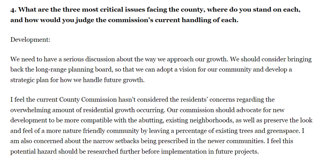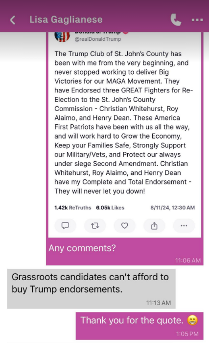 The “stop overdevelopment” message has been largely connected to the indivisible duo of Angelica Gross and Lisa Gaglianese of Nocatee. The indivisible duo had been attempting to push through a slate of 3 candidates to sideline all of the incumbent county commissioners in St. Johns County. On Sunday 8/11/2024, Donald Trump endorsed all 3 sitting St. Johns County Commissioners. Gaglianese offered a statement in response to Trump’s endorsement.