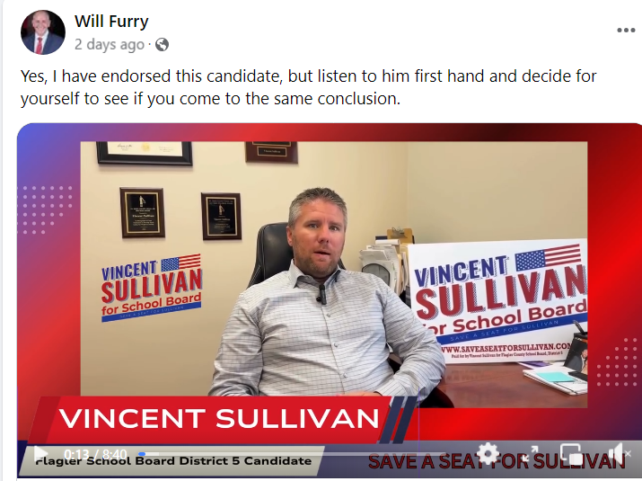 It is important to note that Conservatives currently have a 2-3 minority on the Flagler County School Board with 2 seats up for election in 2024. Current school board chairman and tried and true MAGA Republican Will Furry has endorsed Vincent Sullivan which is an opponent of Ramirez.