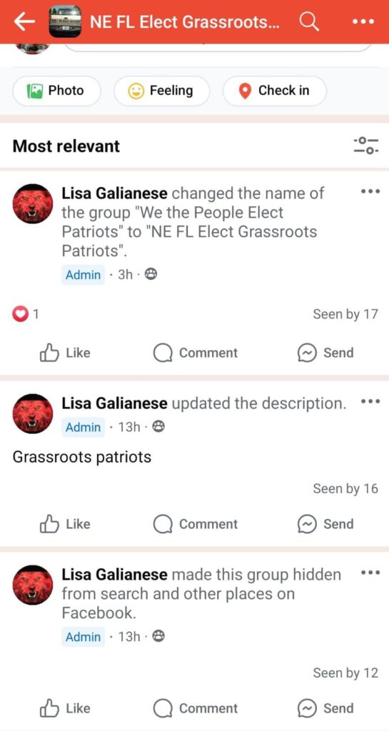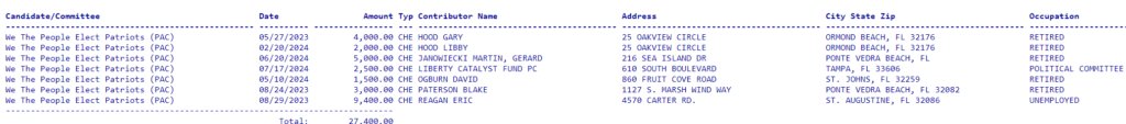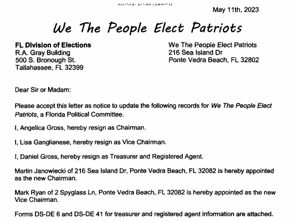 Indivisible’s infiltration of Florida Republican elections began in 2021. I know this, as I was a candidate and personally knew the two infiltrators. Shortly after I was exiled from the Indivisible duo, a Political Action Committee was launched by them to fund their “grassroots” candidates. In fact, Gaglianese even went as far as to tell a friend that they would be “taking over” the St. Johns County GOP during a 2021 luncheon. The PAC created by the Indivisible Duo of Gross and Gaglianese was launched under the name of “We The People Elect Patriots”. They raised in excess of 100k in revenue for their first year, including 90k from a California donor and 10k from a developer.