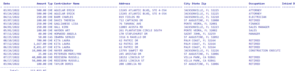 Interestingly, Laura Kita appears to have been a donor to this particular PAC on multiple occasions. It is worth noting that Kita recently threatened the Vice-Chairman of the Saint Johns County Republican Executive Committee via FB Direct Message.