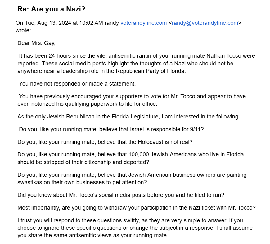 Randy Fine started his email with the phrase “Are You A Nazi”?