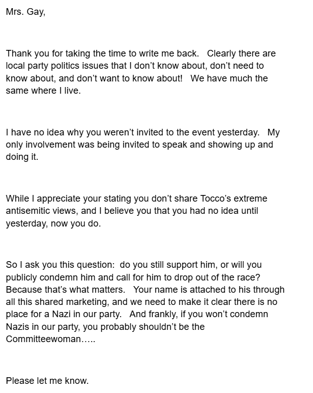 Mrs. Gay graciously responed to Representative Fine’s email and set the record straight stating that she is not running as part of a ticket with Tocco.