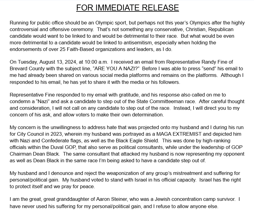 The Gay campaign has released an official statement in Regards to Randy Fine’s ask.