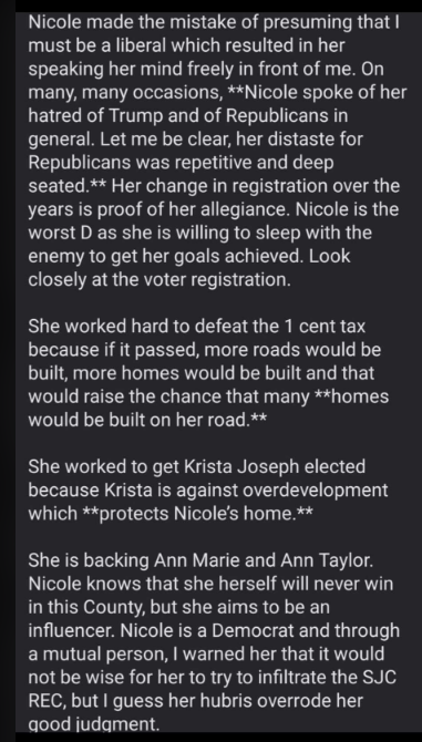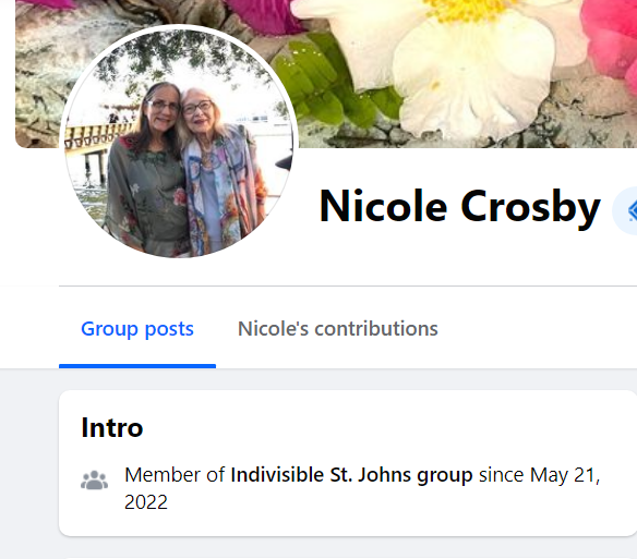 She claims in her own words that she was a Democrat in 2020 and returned back to the Republican Party afterward. Due to Crosby’s aggressive denials I decided to take a deeper look at who is attempting to influence local Florida elections. Nicole Crosby appears to have joined the Indivisible St. Johns County Facebook group in 2022.