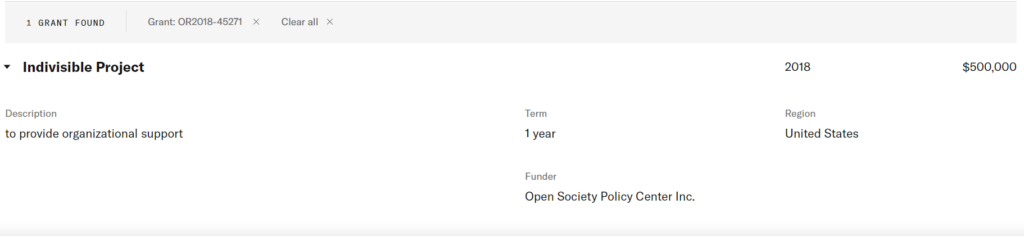 Indivisible isn’t a fly by night outfit. As you can see below from this screen shot taken directly from George Soros’ Open Society Foundation, they received a substantial amount of funding in 2018, shortly after their launch.