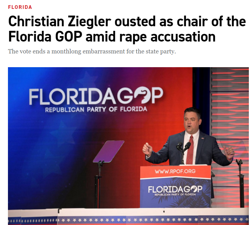 Early in 2024, GOP chairman Christian Ziegler was ousted due to accusations of rape and sexual misconduct.
