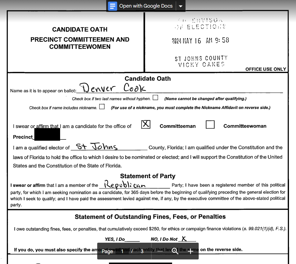 Denver Cook was elected chairman of the local Republican Party on 5/9/2024, but as you can see from the paperwork below, Cook was not a member of the party until 5/16/2024.