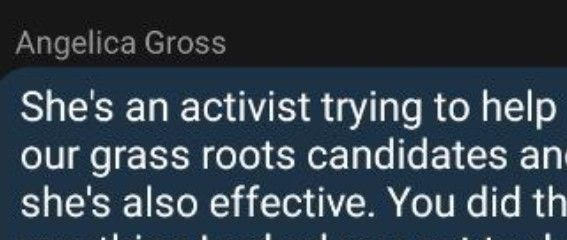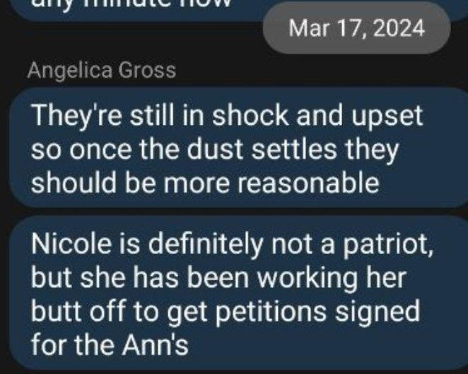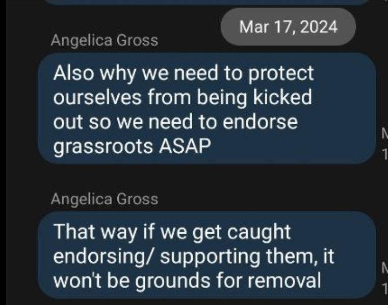In March of 2024, Gross explained by text message that it was important to get her candidates endorsed by the local GOP so that they would not be removed by the party for what was occurring.