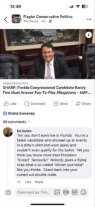 Palm Coast, Florida lies at the heart of Florida’s 6th congressional district, and any path that Randy Fine has to victory must certainly run through that area. Originally developed in 1969, the original development plan encompassed 48,000 home sites on approximately 42,000 acres. Much of the area that now encompasses Palm Coast originally stood as swamp. The water may have been removed from Palm Coast, however the swamp critters still run wild in the area.