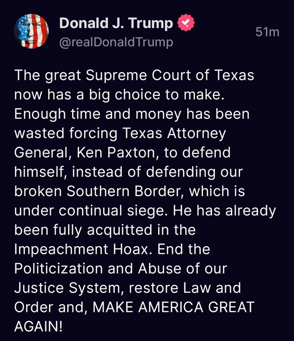 The great Supreme Court of Texas now has a big choice to make. Enough time and money has been wasted forcing Texas Attorney General, Ken Paxton, to defend himself, instead of defending our broken Southern Border, which is under continual siege. He has already been fully acquitted in the Impeachment Hoax. End the Politicization and Abuse of our Justice System, restore Law and Order and, MAKE AMERICA GREAT AGAIN!